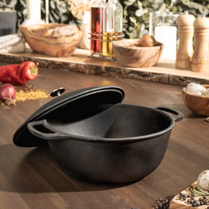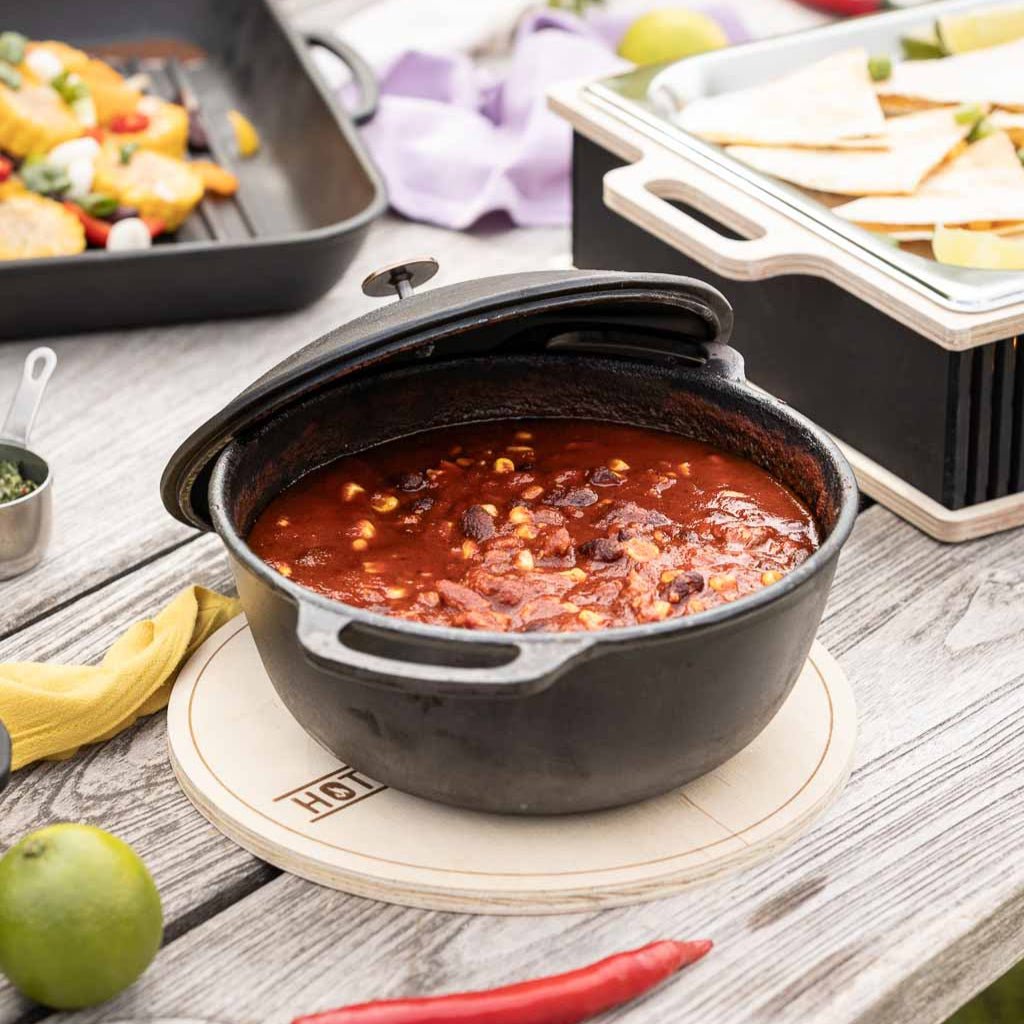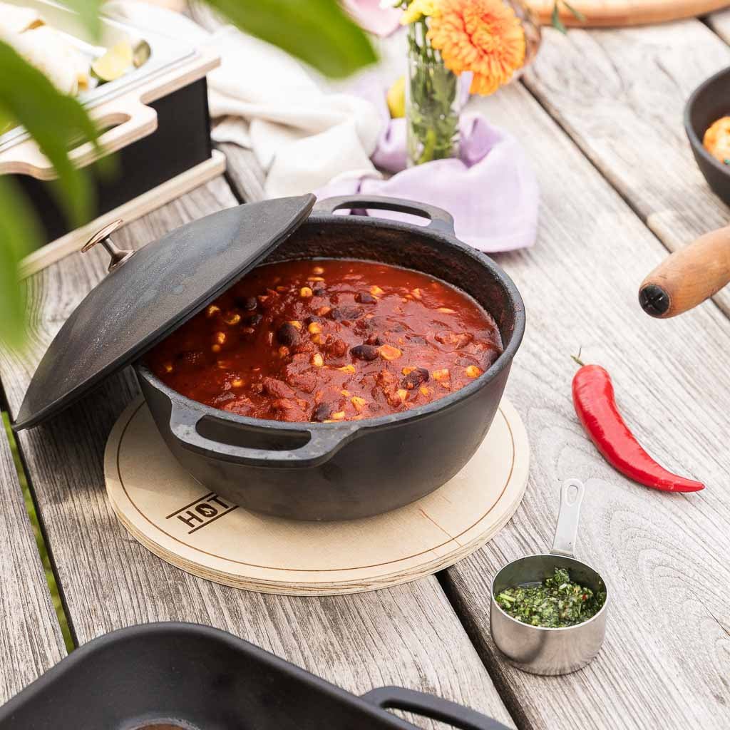 The HOTTY cast iron pot you'll never want to be without. Whether it's BBQ sauce, chili, beans, or a small stew – this 2-liter pot made of solid cast iron brings heat exactly where you need it. It retains heat evenly, keeps your food warm for hours, and brings the full flavor of the fire straight from the grill, fire plate, or stovetop to the table. The classic lid closes tightly and the material reliably stores heat.
