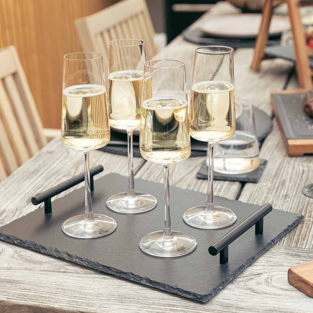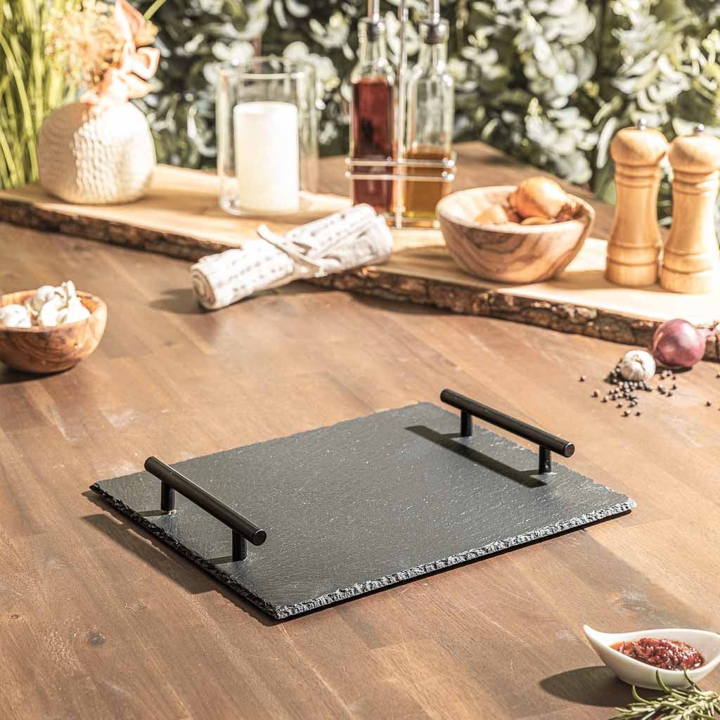 Whether it's chilled drinks, fresh dips, or small snacks, this natural slate serving board can handle it all. The two black metal handles ensure a secure grip, and the slate stays pleasantly cool – ideal when it gets hot outside. The chamfered edges give the board a natural look that simply complements any BBQ. Robust, stylish, and truly practical – for serving, arranging, or transporting.