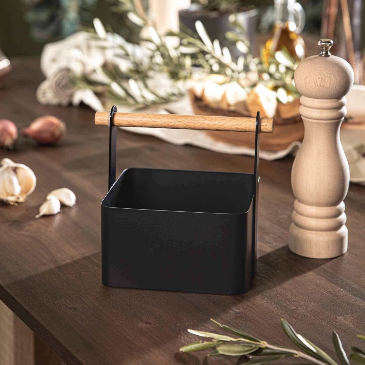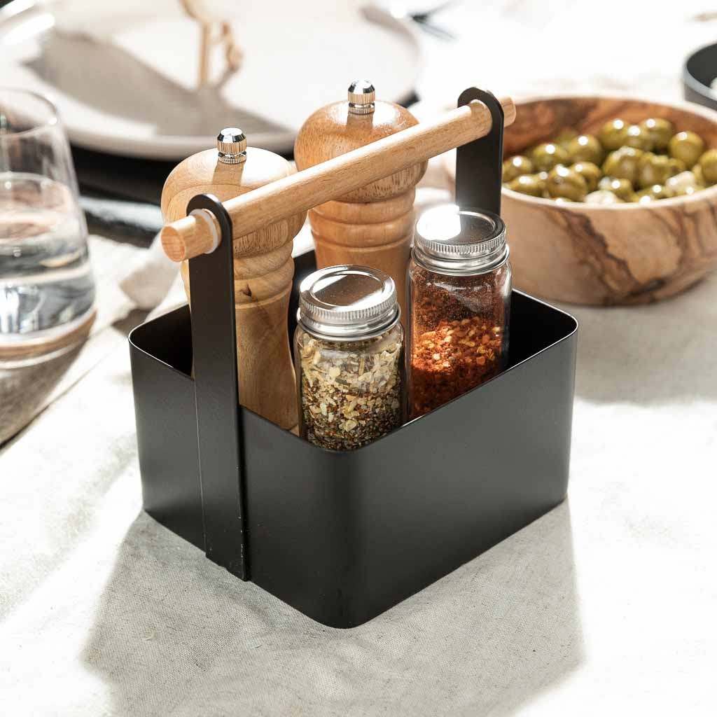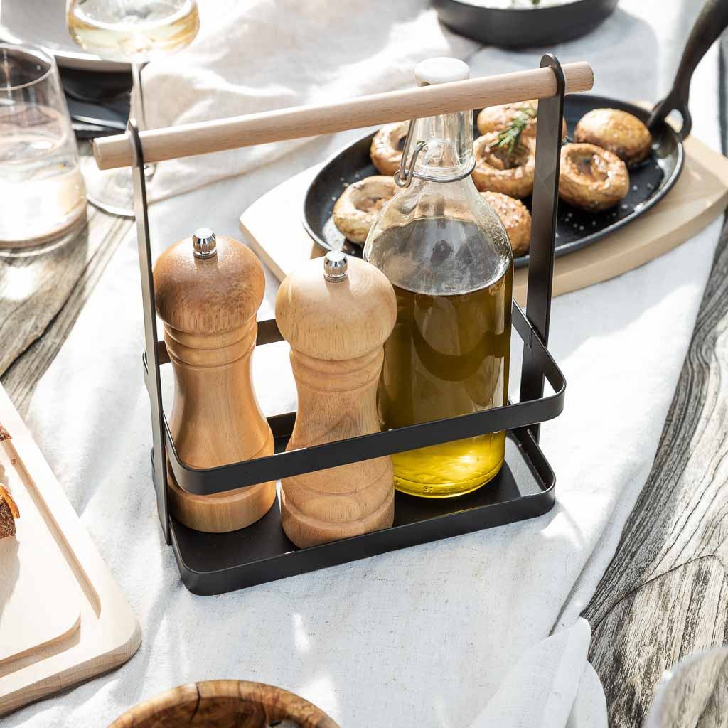 One hand on the grill, the other desperately searching for salt? Not with the HOTTY Table Caddy! It has space for everything you need for the perfect BBQ – from spices and sauces to grilling utensils. Simply place it down, reach in, and get started! Thanks to the matte black powder coating and solid wooden handle, the caddy not only looks great but is also easy to transport.