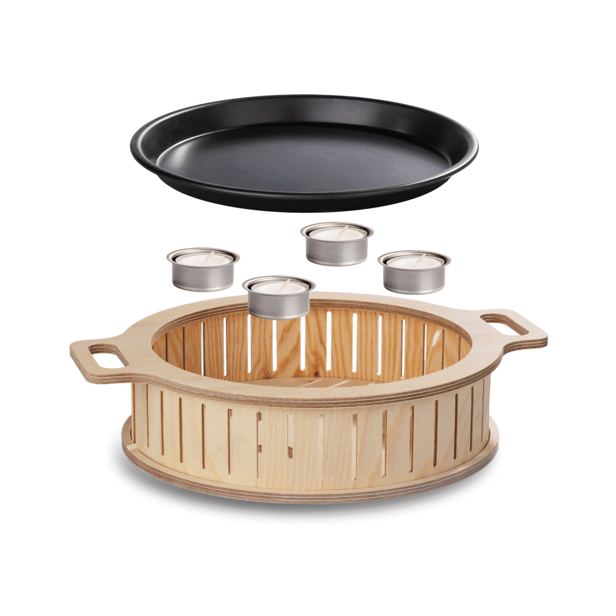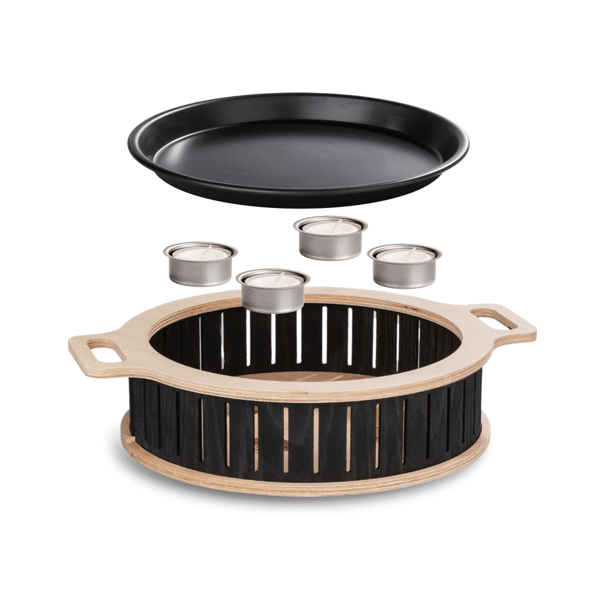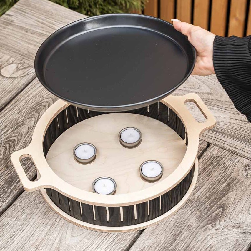 Did your 8th potato crash through the grill grate? You can place the Hotty Halo's tray on the grill and use it like a plancha. The finished food then simply sits over the candles and stays warm until everyone is full.