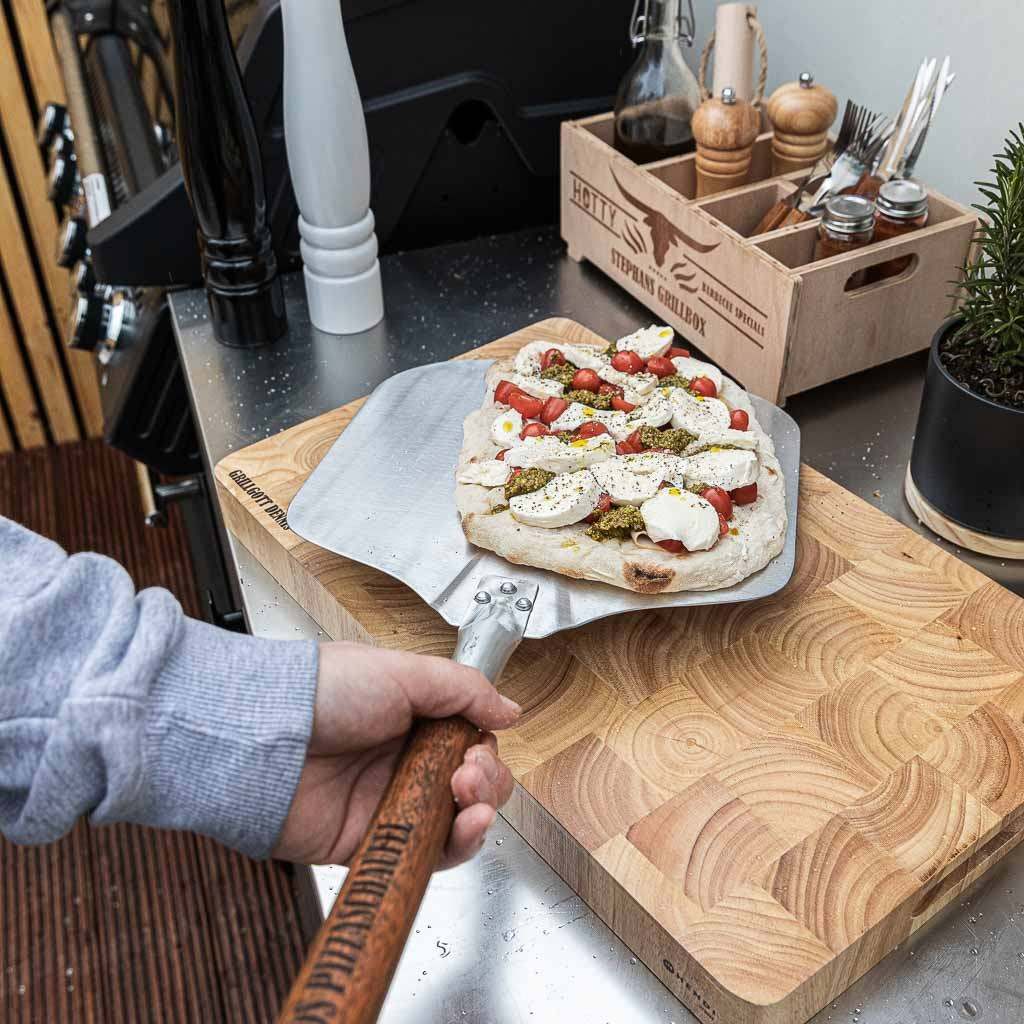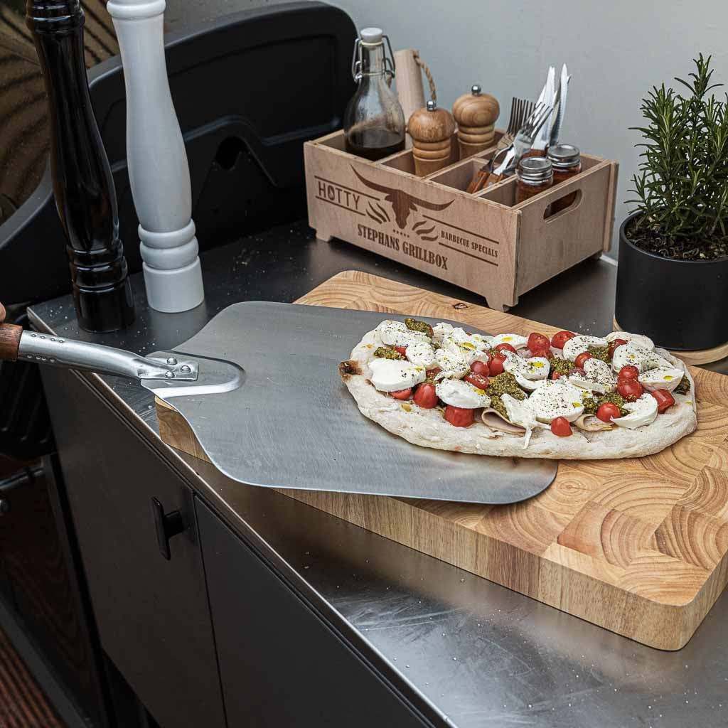 Whether it's crispy stone-baked pizza, tarte flambée, or fresh bread – with the HOTTY Large pizza peel , sliding it in and out of the oven or grill is effortless. The compact stainless steel surface ensures stability and precise handling, while the ergonomic wooden handle fits comfortably in the hand. Thanks to the custom engraving, your pizza peel becomes a unique highlight in your grilling and baking equipment.