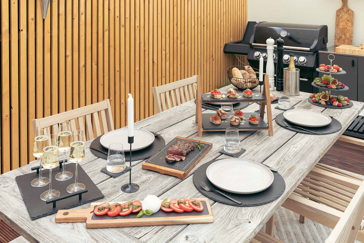 Deze onderzetters van natuurleisteen beschermen je tafel – en zien er ook nog eens fantastisch uit. De afgeschuinde randen geven elk stuk een eigen, natuurlijk karakter. Of het nu wijn, water of een gin-tonic is, het gladde, koele oppervlak past bij elk glas en houdt vocht vast. Ideaal voor de barbecuetafel, sociale bijeenkomsten of gewoon voor dagelijks gebruik. De onderzetters worden geleverd in een praktische set van vier.